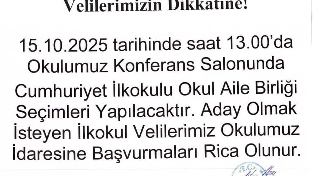 15.10.2025 Tarihinde Saat 13:oo da Okulumuz Konferans Salonunda Cumhuriyet İlkokulu Okul Aile Birliği Seçimi Yapılacaktır.